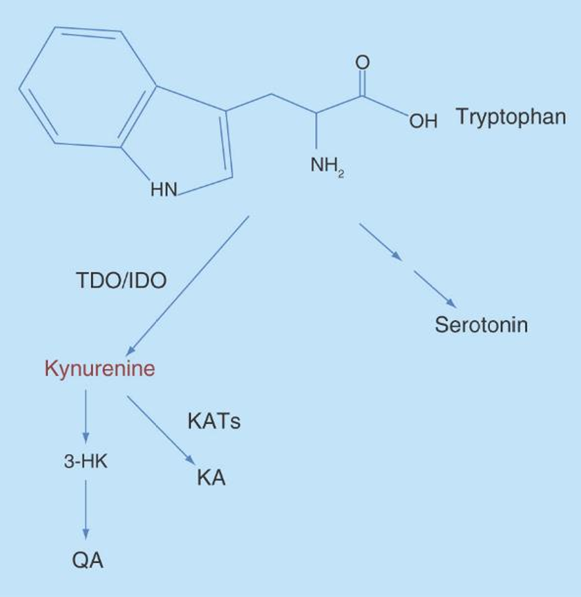 관련 경로 중 하나는 세로토닌의 전구체인 트립토판(Trp)을 키누레닌(Kyn)으로 산화시켜 뇌에서 여러 신경 활성 분자를 생성한다. tryptophan 2,3-dioxygenase와 indoleamine 2,3-dioxygenase는 각각 간과 간 외에서 Kyn 경로를 촉발하며, 둘 다 만성 스트레스에 의해 활성화될 수 있다. Tryptophan 2,3 dioxygenase는 실제로 GC와 반응하는 반면, indoleamine 2,3-dioxygenase는 염증성 사이토카인에 의해 유도된다. Kyn 경로는 뇌의 세로토닌 수치와 세로토닌 전달 및 그 기분과 행동 효과에 영향을 미칠 뿐만 아니라 신경 염증 특성을 갖는 Trp 대사 산물의 생성을 담당하거나 뇌의 글루타메르그성 신경 전달에 긍정적 또는 부정적으로 영향을 미칠 수 있다. 이는 반응성 산소종 및 염증 유도제인 3 hydroxykynurenine과 N-methyl-D-aspartate receptor 작용제인 quinolinic acid의 생성을 선호하는 경로의 변화가 항산화제이자 N-methyl-D-aspartate receptor 억제제인 kynurenic acid보다 우울증을 촉진할 수 있다는 것을 의미한다.